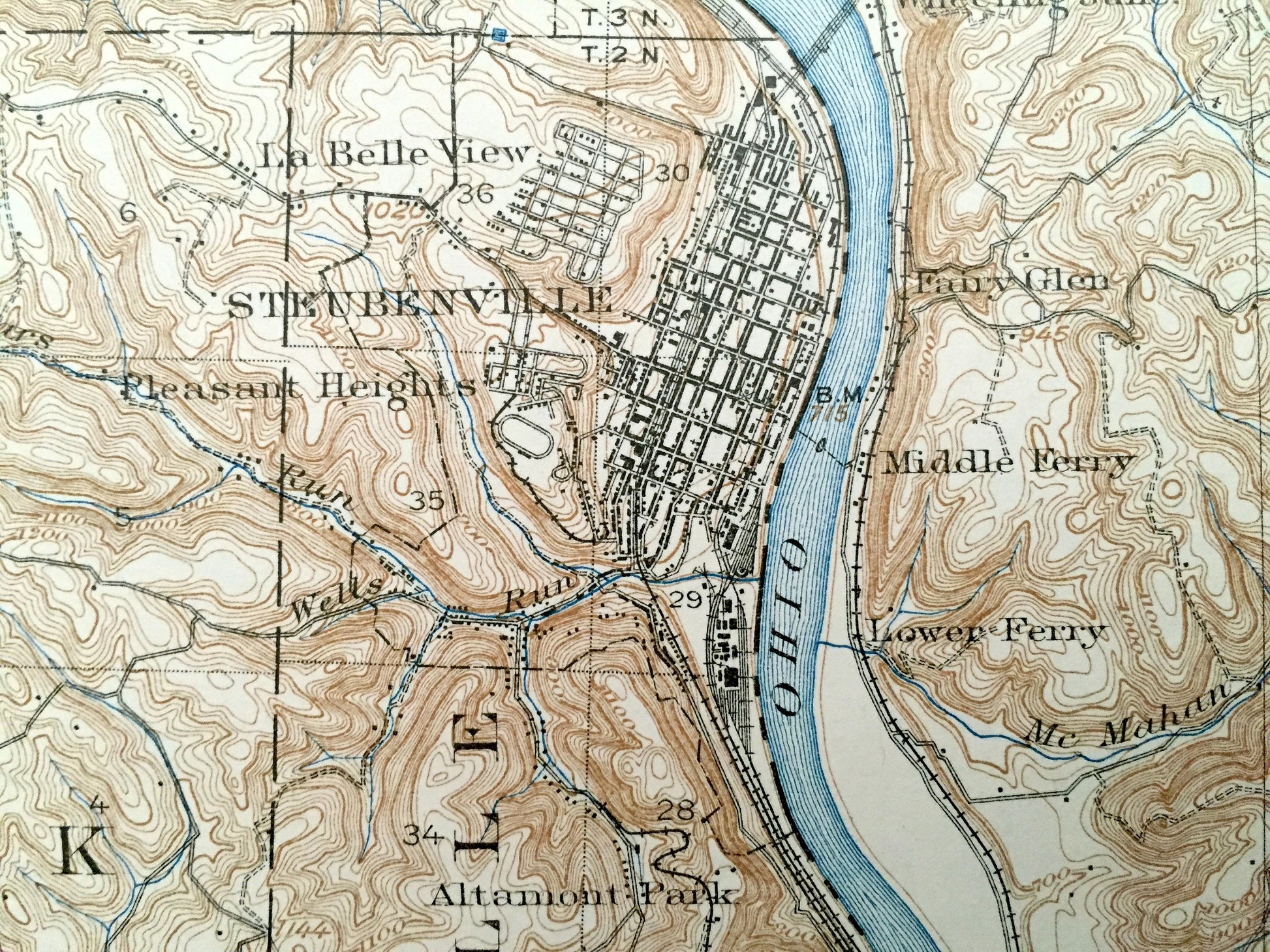 Beautiful, antique map of Steubenville, Ohio and surrounding West Virginia and Pennsylvania areas. This is an authentic 1904 edition, 1938 print from the U.S. Geological Survey and NOT a computer reproduction.