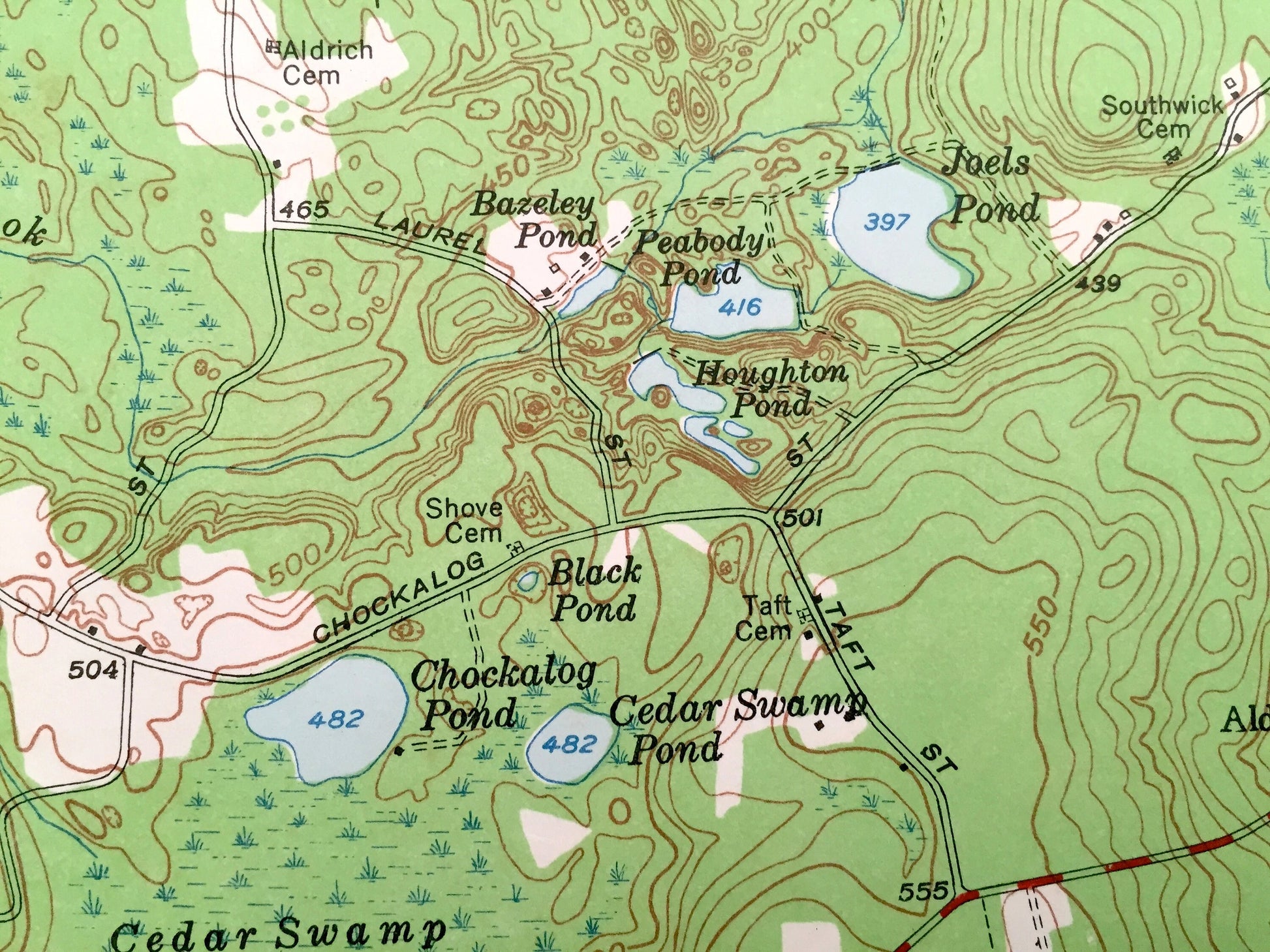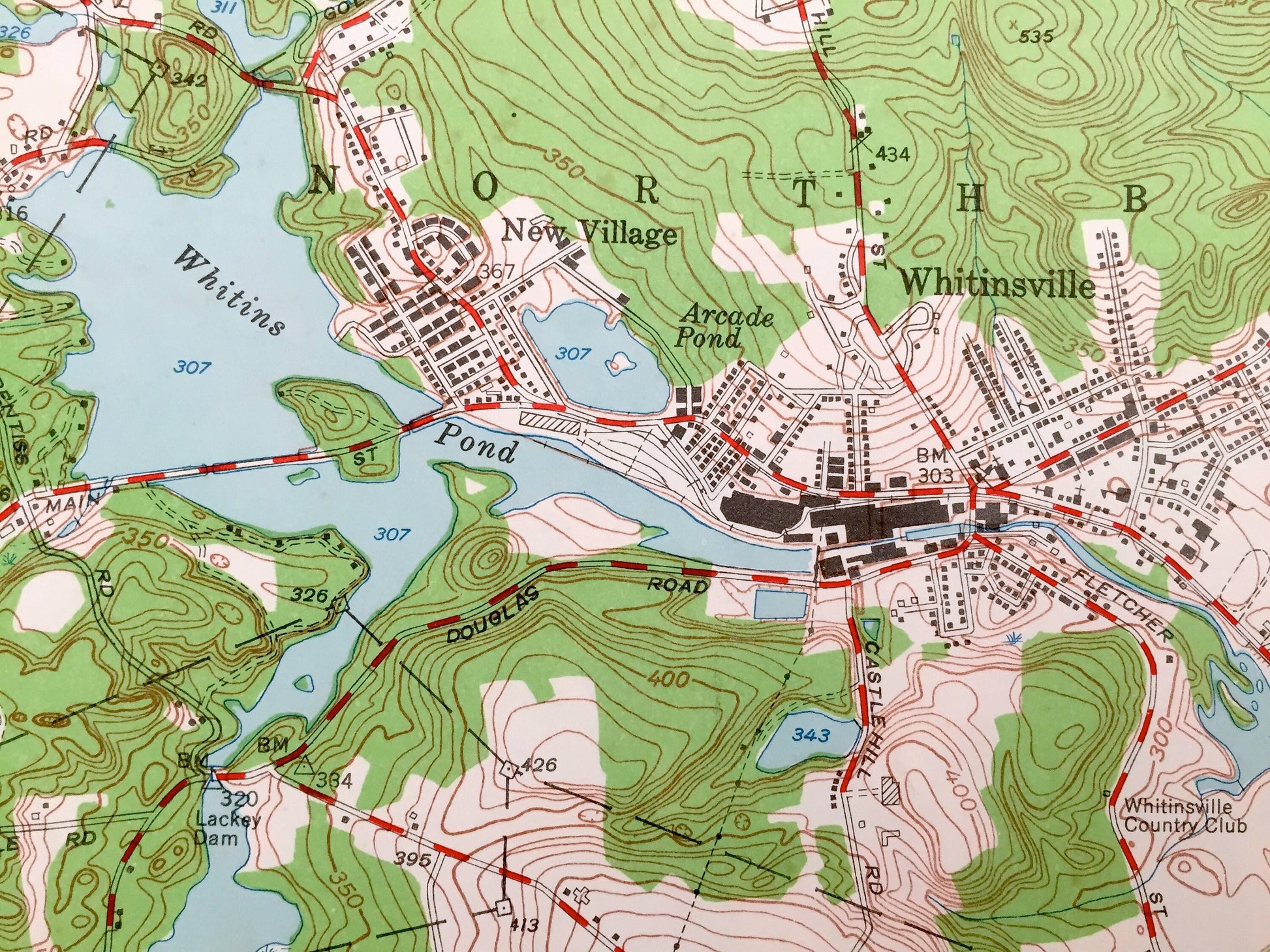 Points of Interest: Tassletop School, Aldrich Pond, Aldrich School, Happy Hollow School, New York New Haven and Hartford Railroad, East Douglas Station, Lackey Pond, Whitins Pond, Whitinsville Country Club, Blackstone Canal, Peabody Pond and many more roads, houses, reservoirs, ponds, and hills.