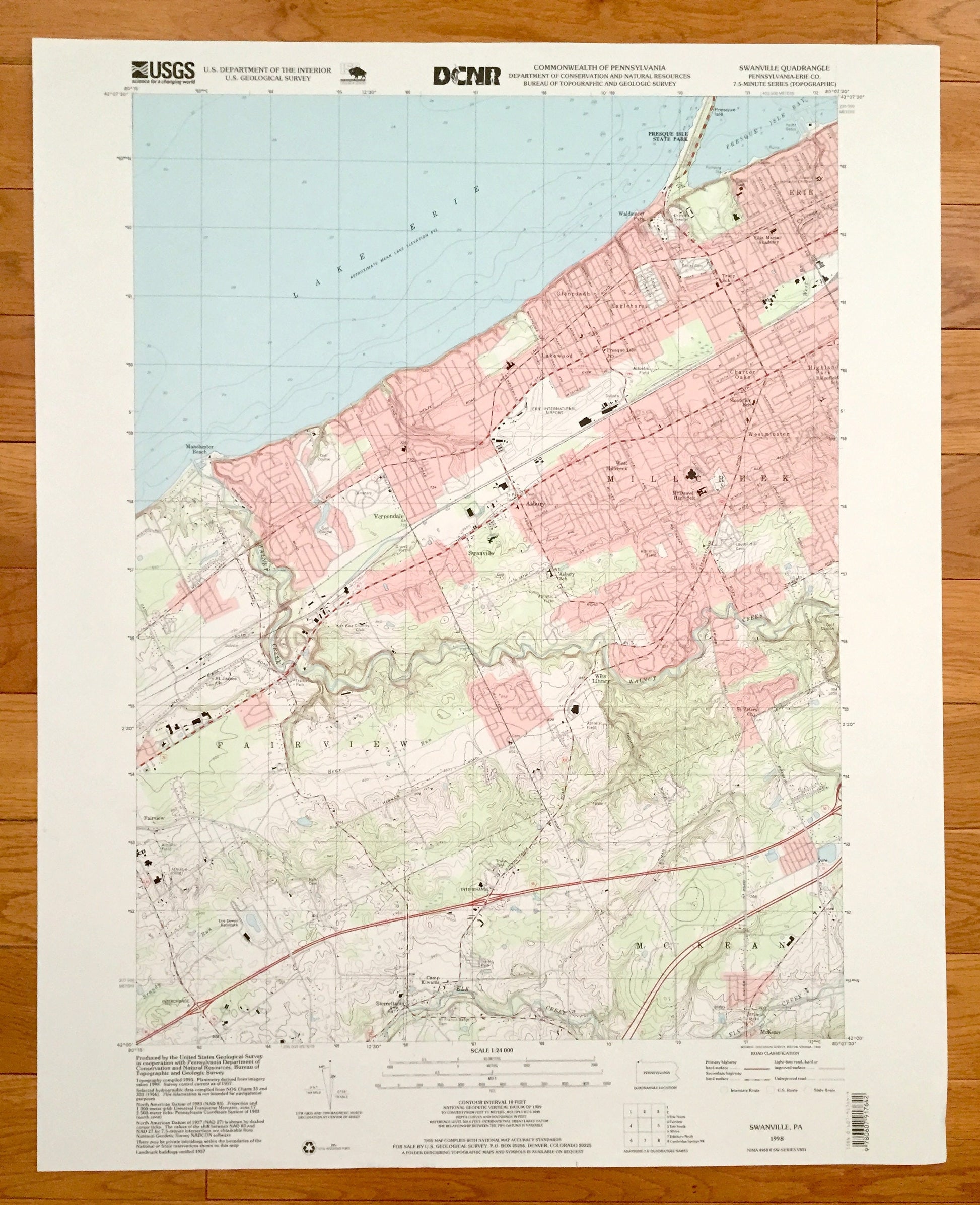 Beautiful, antique map of Swanville, Pennsylvania and surrounding Erie County area. This is an authentic 1998 print from the U.S. Geological Survey and NOT a computer reproduction.