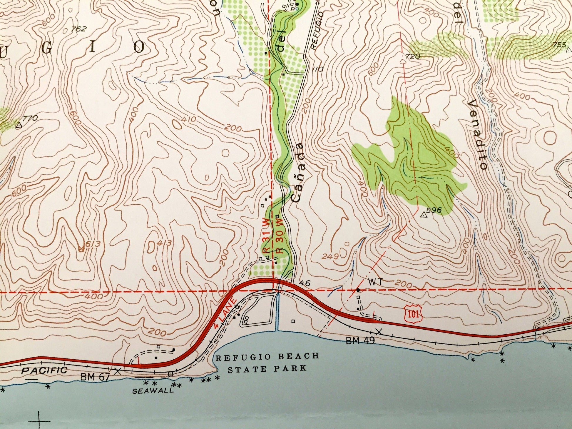 Points of Interest: Pacific Ocean, Santa Barbara Channel, Los Padres National Forest, Santa Ynez Mountains, Southern Pacific Railroad, Leon Canyon, Aquajito Canyon, Las Flores Canyon, and many more roads, houses, reservoirs, ponds, and hills.