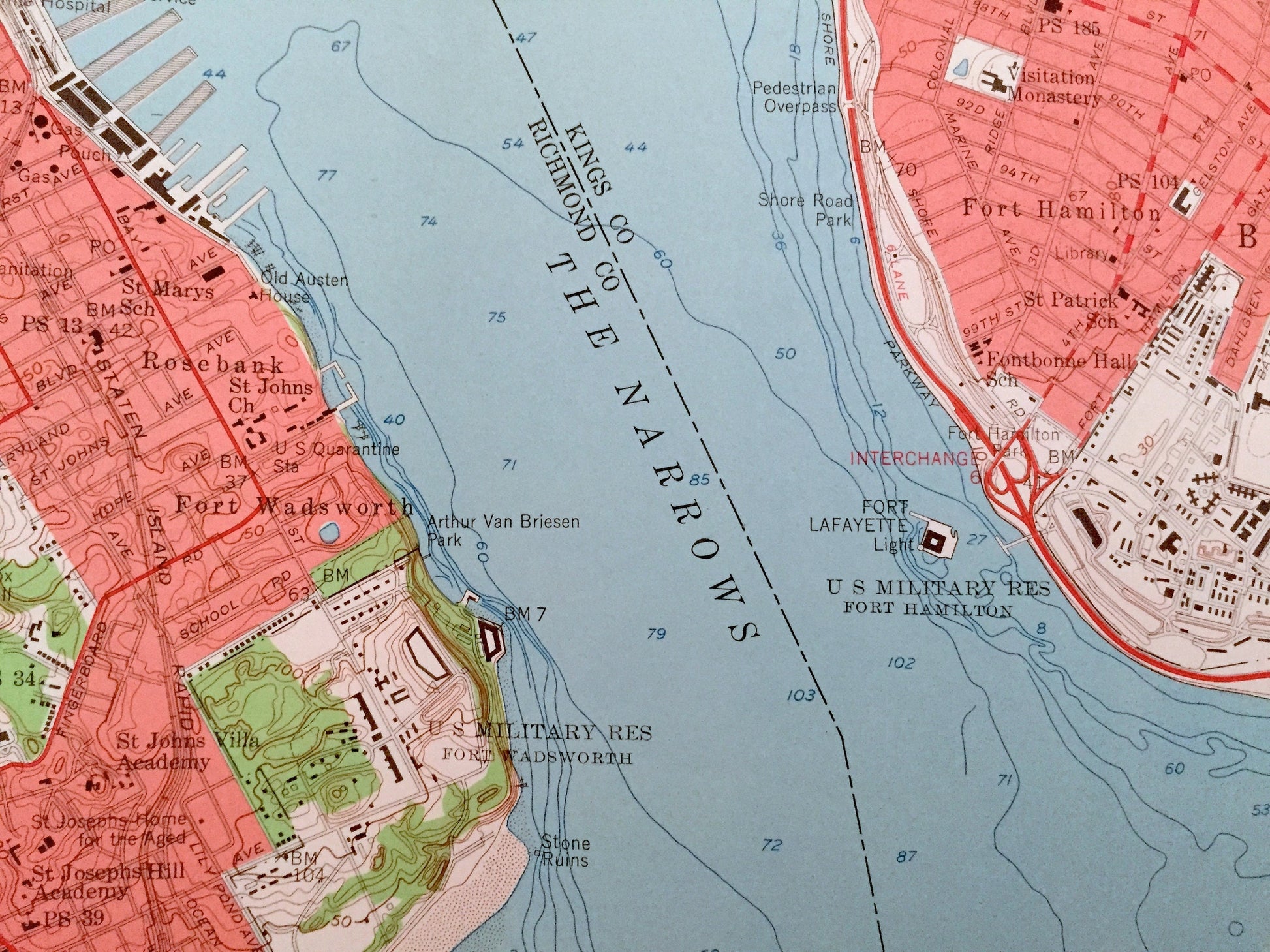 Beautiful, antique map of The Narrows, New York including Brooklyn, Coney Island and Staten Island. This is an authentic 1955 print from the U.S. Geological Survey and NOT a computer reproduction.