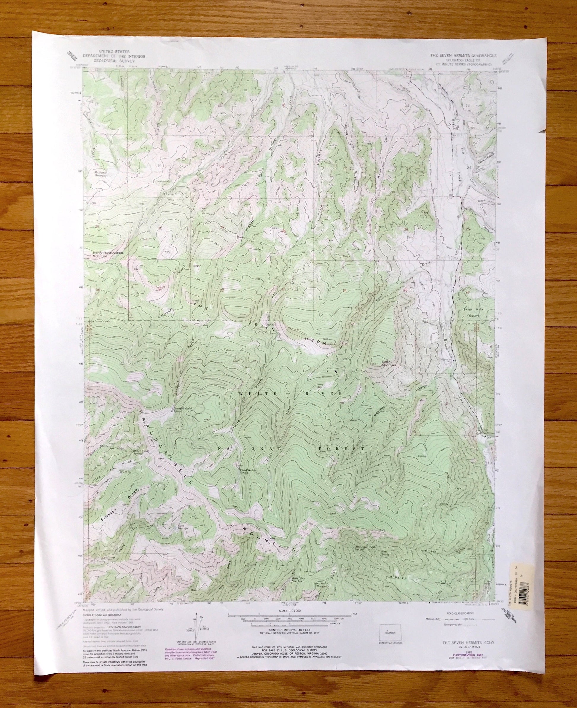 Beautiful, antique map of The Seven Hermits mountain range in Colorado and surrounding Eagle County area, including White River National Forest. This is an authentic 1962 edition, 1988 print from the U.S. Geological Survey and NOT a computer reprint.