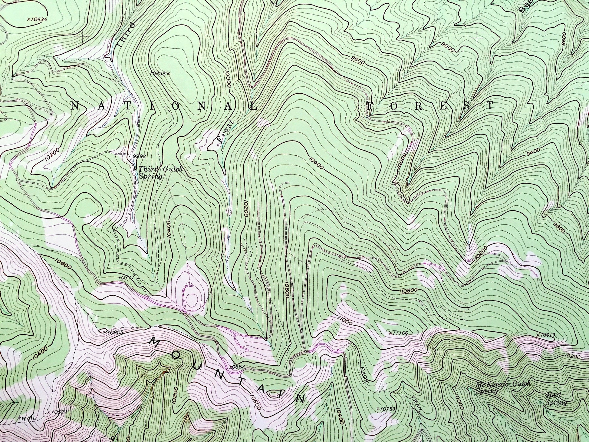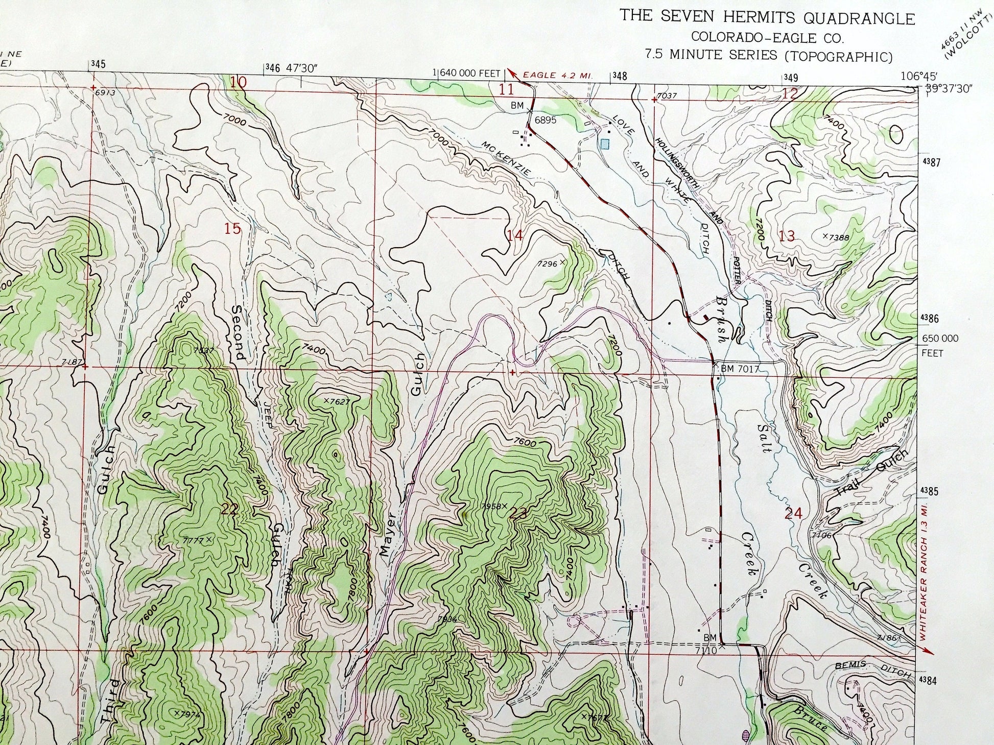 Points of Interest: Eagle County, White River National Forest, Hardscrabble Mountain, Brush Creek, Abrams Creek, Hernage Creek, Frost Creek, Skim Milk Basin, Miller Gulch Creek, Coffin Mountain, Alkali Creek, Bruch Creek, The Seven Hermits, Erickson Ridge, McKenzie Gulch, McHatten Reservoir, Salt Creek, and many more smaller lakes, creeks, houses, schools, roads, camps and train tracks.