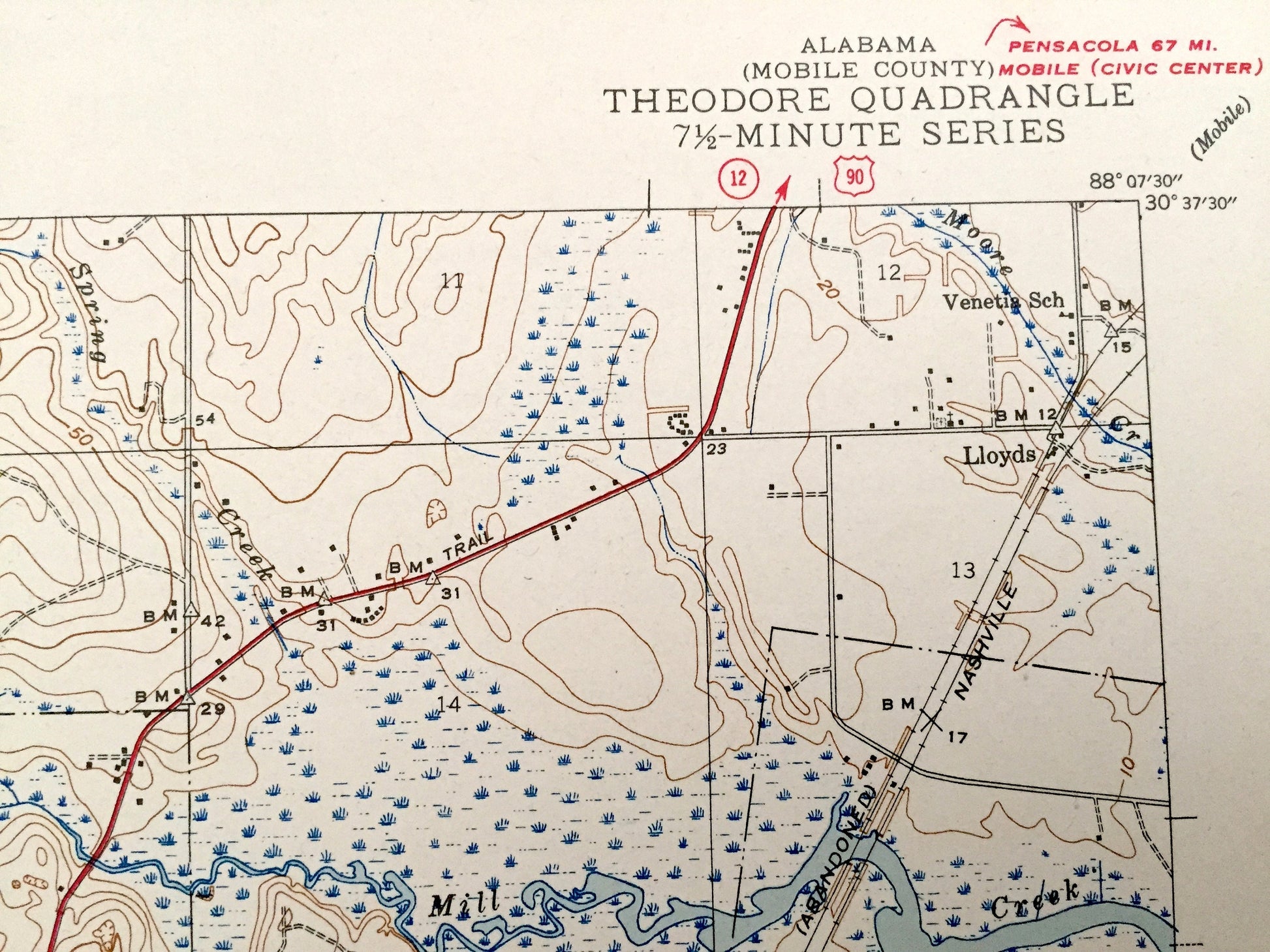 Points of Interest: Halls Mill Creek, Rattlesnake Bayou, Hollingers Island, Louisville & Nashville Railroad, Gulf Mobile & Ohio Railroad, Fowl River, Campground Branch, Whiskey Branch, Rabbit Creek, Moore Creek, and lots more hills, mountains, creeks, towns, roads and train tracks.