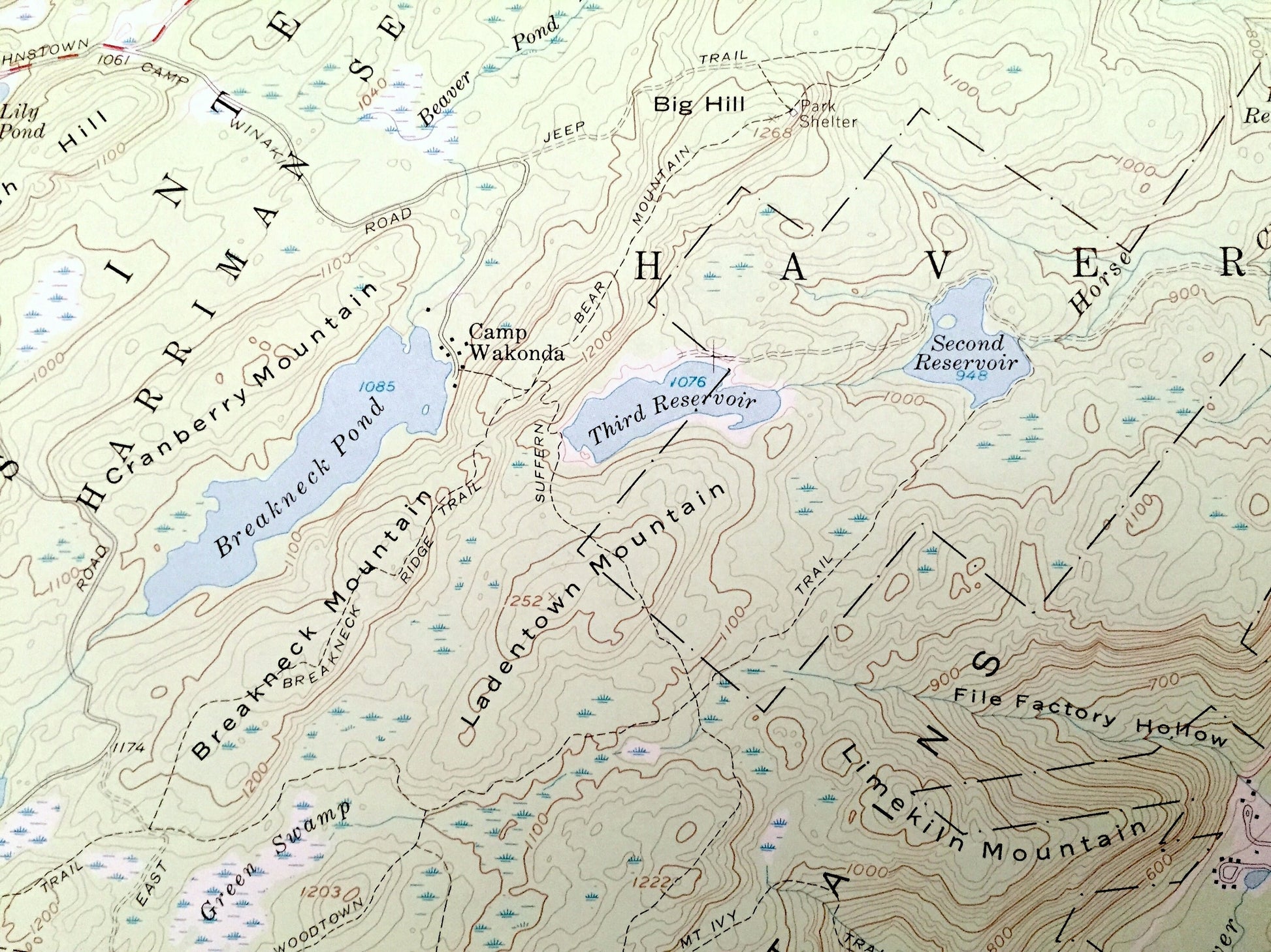 Points of Interest: Palisades Interstate Park, Letchworth Village State Mental Institution, Ramapo Mountains, Kanawauke Circle, Summit Park Sanatorium, Vacation Camp for the Blind, Rockhouse Mountain, Grape Swamp Mountain, Irish Mountain, Squirrel Swamp Mountain, Catamount Mountain, South Mountain, Jackie Jones Mountain, Collaberg Mountain, Kanes Open Camp (BSA), Lake Kanawauke, Lake Welch, Breakneck Pond, Lake Wanoksink, Pine Meadow Lake, Mahwah River, Diamond Creek, Lake Tiorati Brook, Minisceongo Creek, South Branch, and many more hills, streams, ponds, houses, schools, railroads, churches and roads.