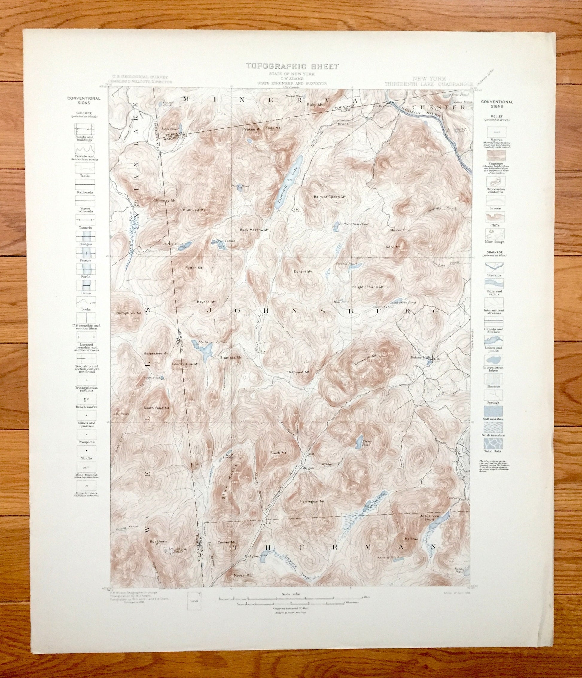 See what The Adirondacks looked like more than 120 years ago. Lots of intricate details and geological contours. Map even has little squares for every house that existed at the time. The USGS cartographers were very thorough back then! This is one of the rare, earlier maps with a map legend on the front. On the back is a description of topographic symbols and map guide.