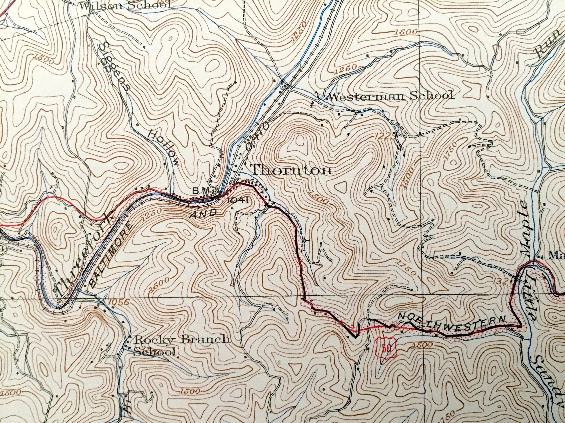 Points of Interest: Threefork Creek, Raccoon Creek, Baltimore & Ohio Railroad, Tygart River, Mt Phoebe, Glade Run, Siggens Hollow, Wickwire Run, and lots more hills, mountains, creeks, towns, roads and train tracks.