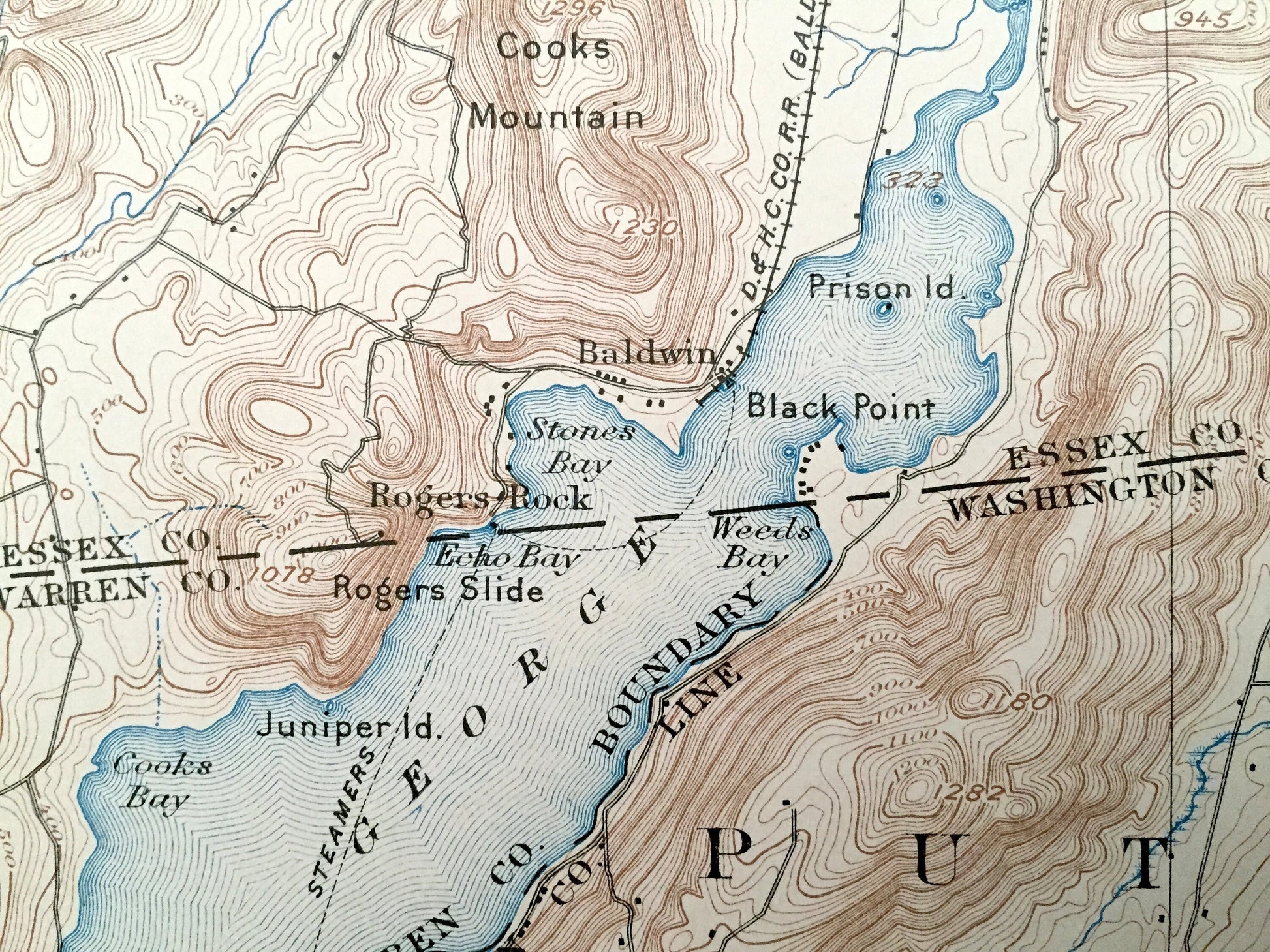 Points of Interest: Lake Champlain, Lake George, Fort Ticonderoga, Bulwagga Mountain, Gilligans Bay, Miller Mountain, Dibble Hollow, Sugar Hill, Breeds Hill, Buck Mountain, Keeney Mountain, Ticonderoga Airport, Three Brothers, Ticonderoga Country Club, Bear Mountain, Cooks Mountain, South Mountain, Records Hill, Camp Adirondack, Huckleberry Mountain, Lapham Island, Lapham Bay, Stony Cove, Cedar Swamp, The Pinnacle, Beadles Cove, Larraees Point, Mount Independence, Mount Defiance, East Creek, Sunset Lake and lots more hills, creeks, towns, schools, churches, roads, coves, islands and marshes.