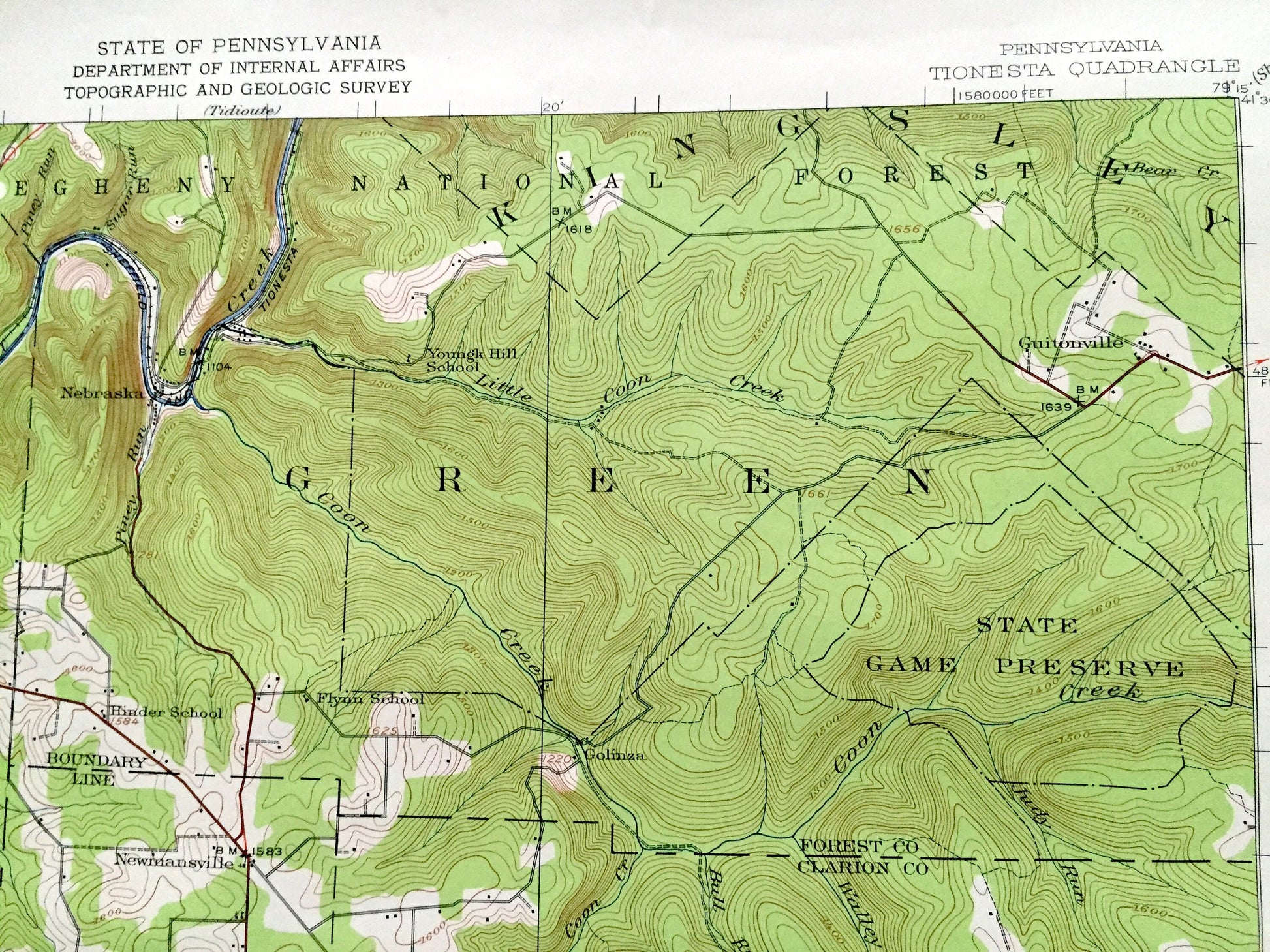 Beautiful, antique map of Tionesta, Pennsylvania and surrounding Forest County, Venango County & Clarion County area. This is an authentic 1922 edition, 1958 print from the U.S. Geological Survey and NOT a computer reproduction.