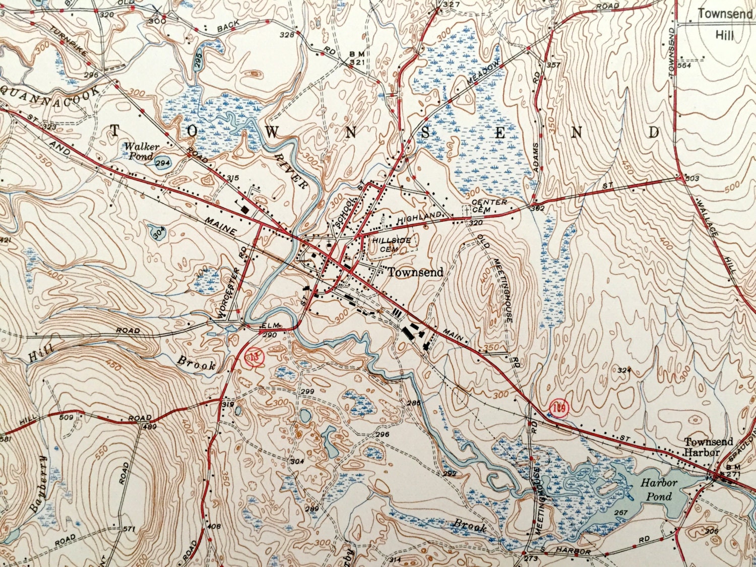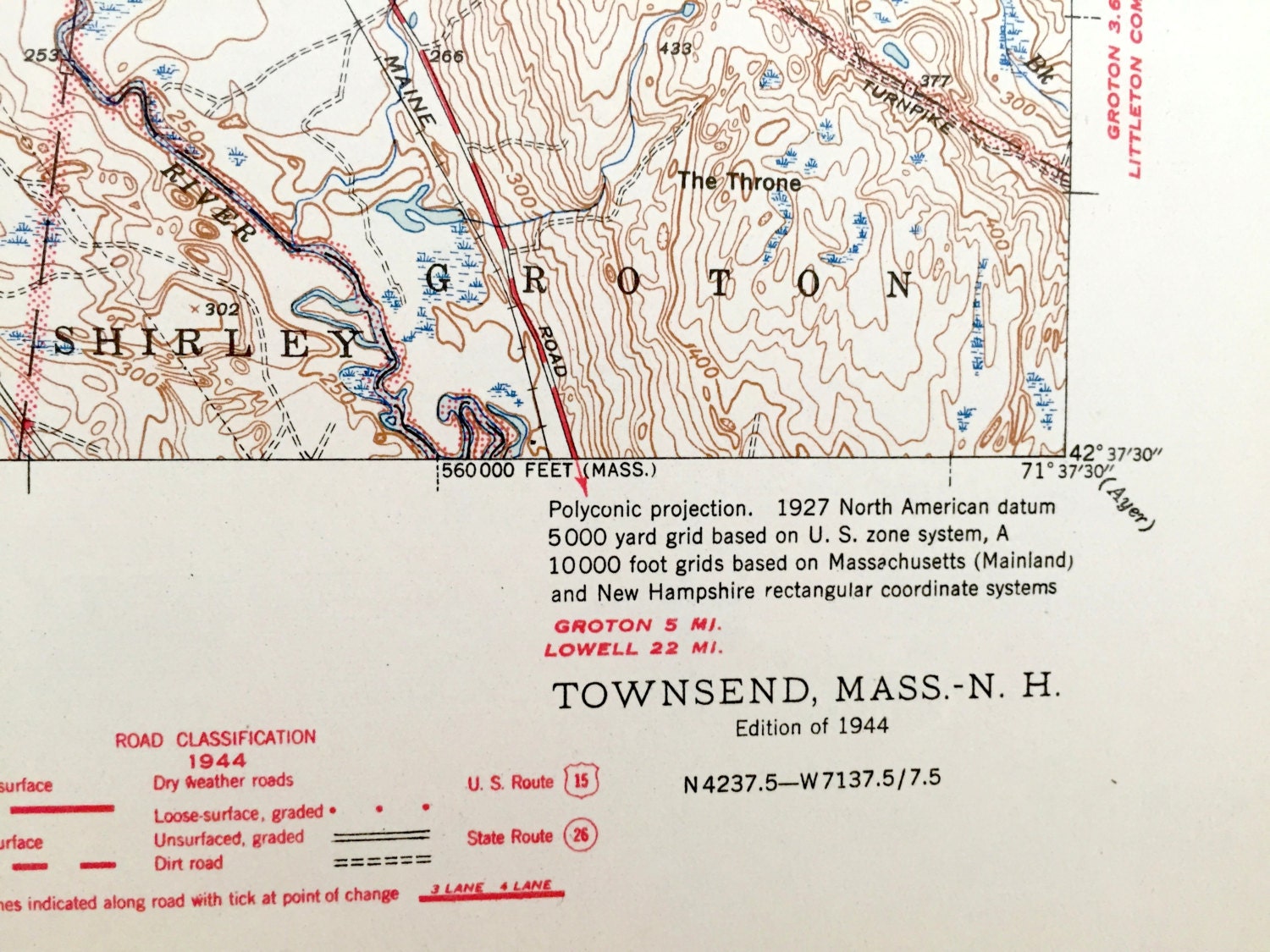 Beautiful, antique map of Townsend, Massachusetts and surrounding Middlesex County & Hillsborough County, New Hampshire area. This is an authentic edition of 1944 print from the U.S. Geological Survey and NOT a computer reproduction.