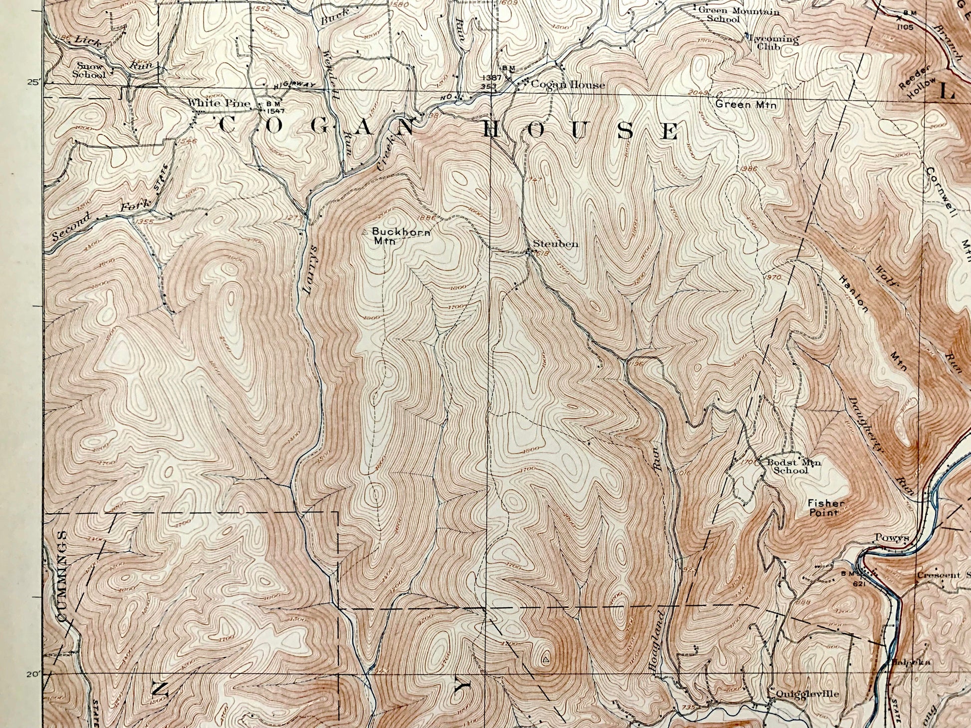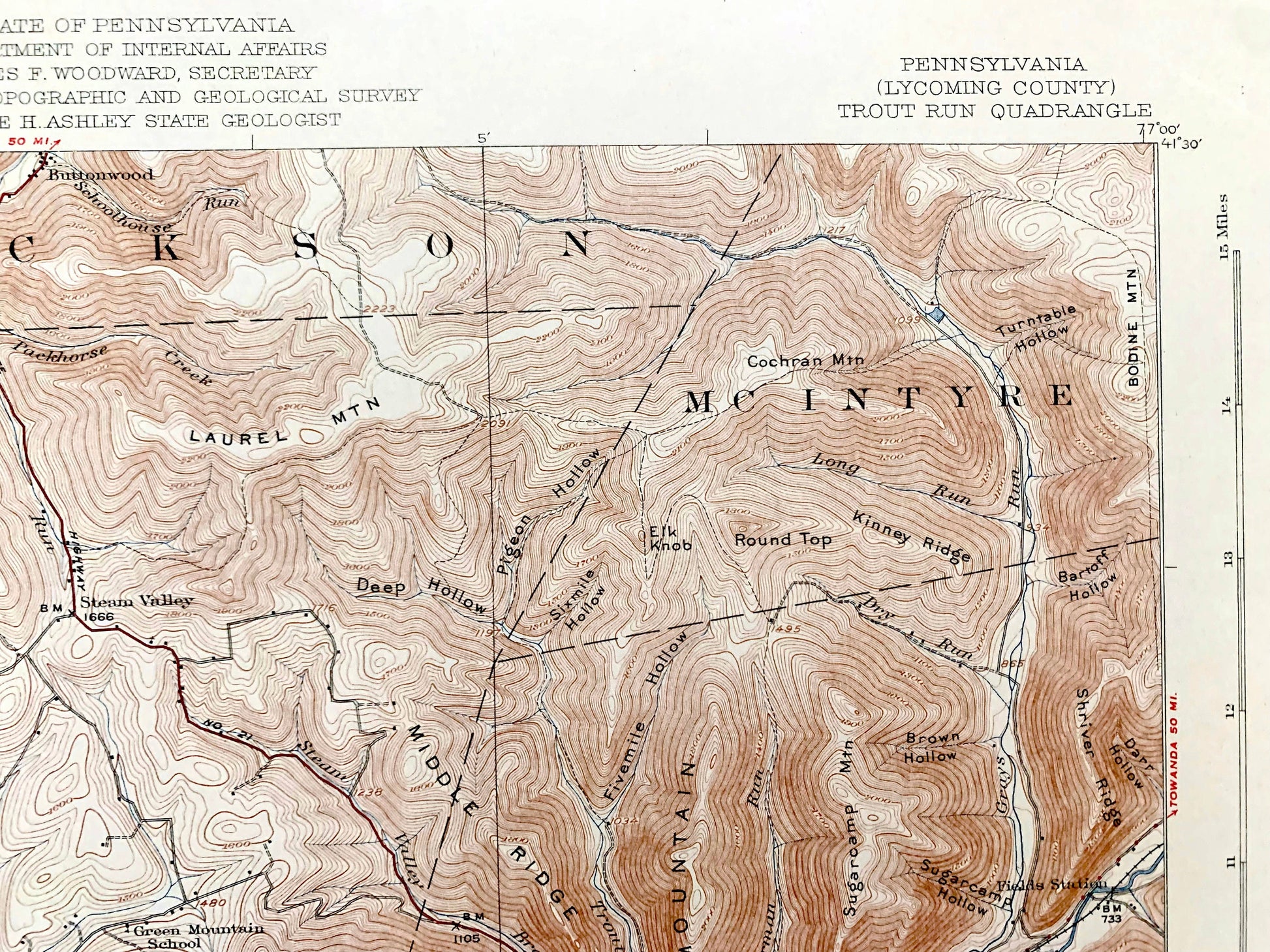 Beautiful, antique map of Trout Run, Pennsylvania and surrounding Lycoming County area. This is an authentic 1923 edition, 1923 print from the U.S. Geological Survey and NOT a computer reproduction.