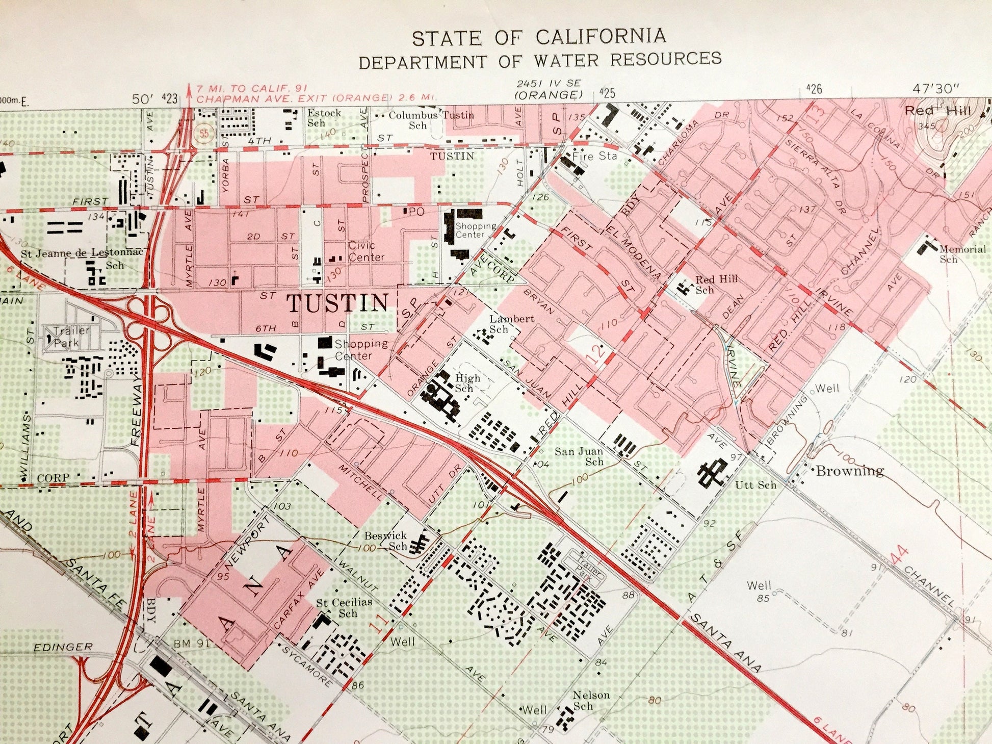 Beautiful, antique map of Tustin, California and surrounding Orange County. This is an authentic 1965 edition, 1967 print from the U.S. Geological Survey and NOT a computer reproduction.