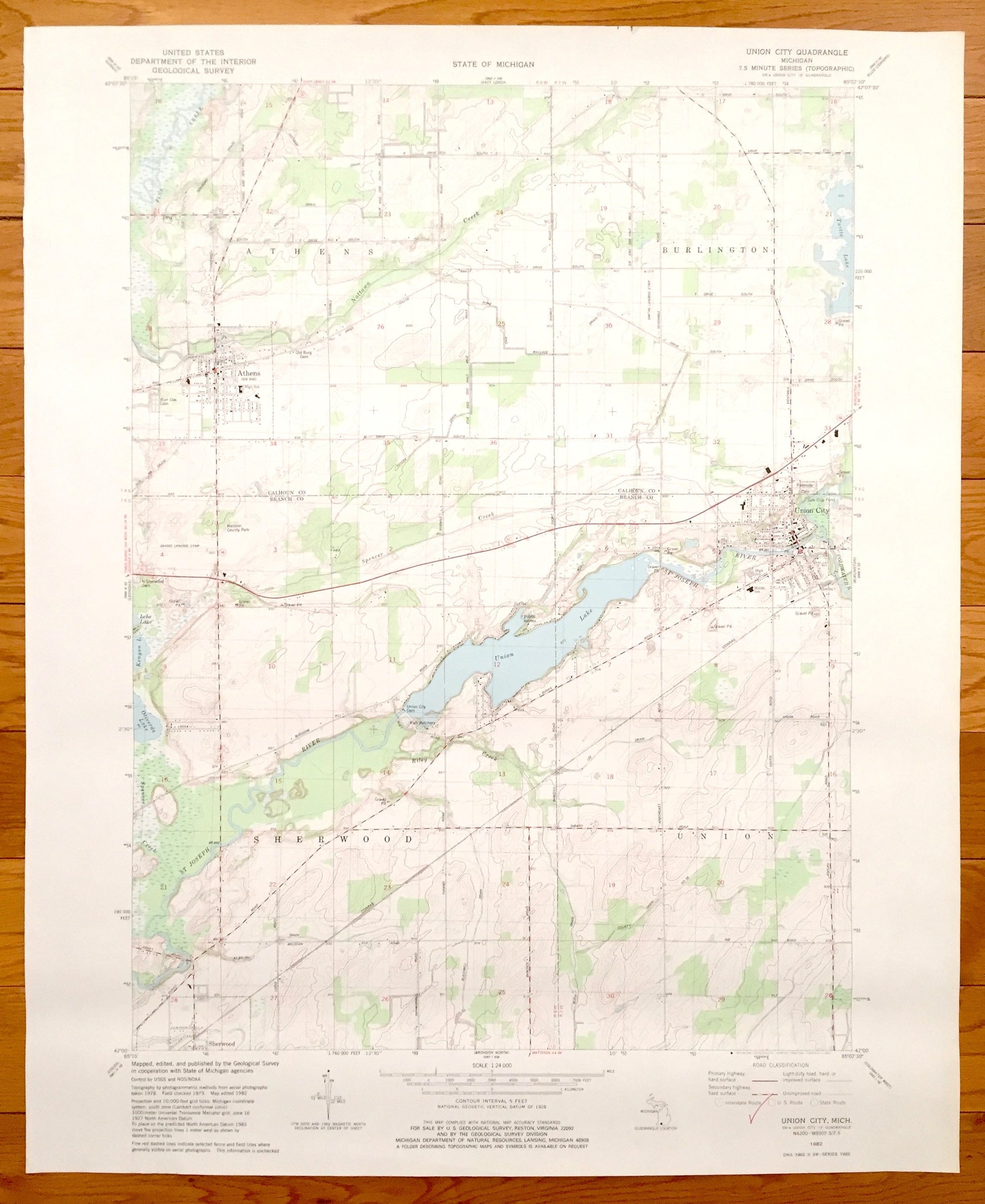 Beautiful, antique map of Union City, Sherwood, Burlington, Athens and Union, Michigan. This is an authentic 1982 print from the U.S. Geological Survey and NOT a computer reproduction.