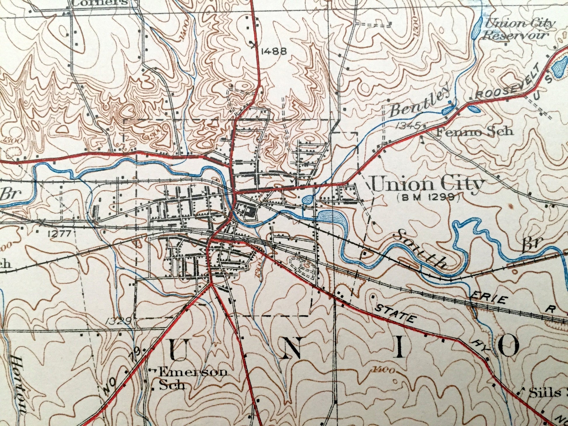 Beautiful, antique map of Union City, Pennsylvania and surrounding Erie & Crawford County areas. This is an authentic 1932 print from the U.S. Geological Survey and NOT a computer reproduction.