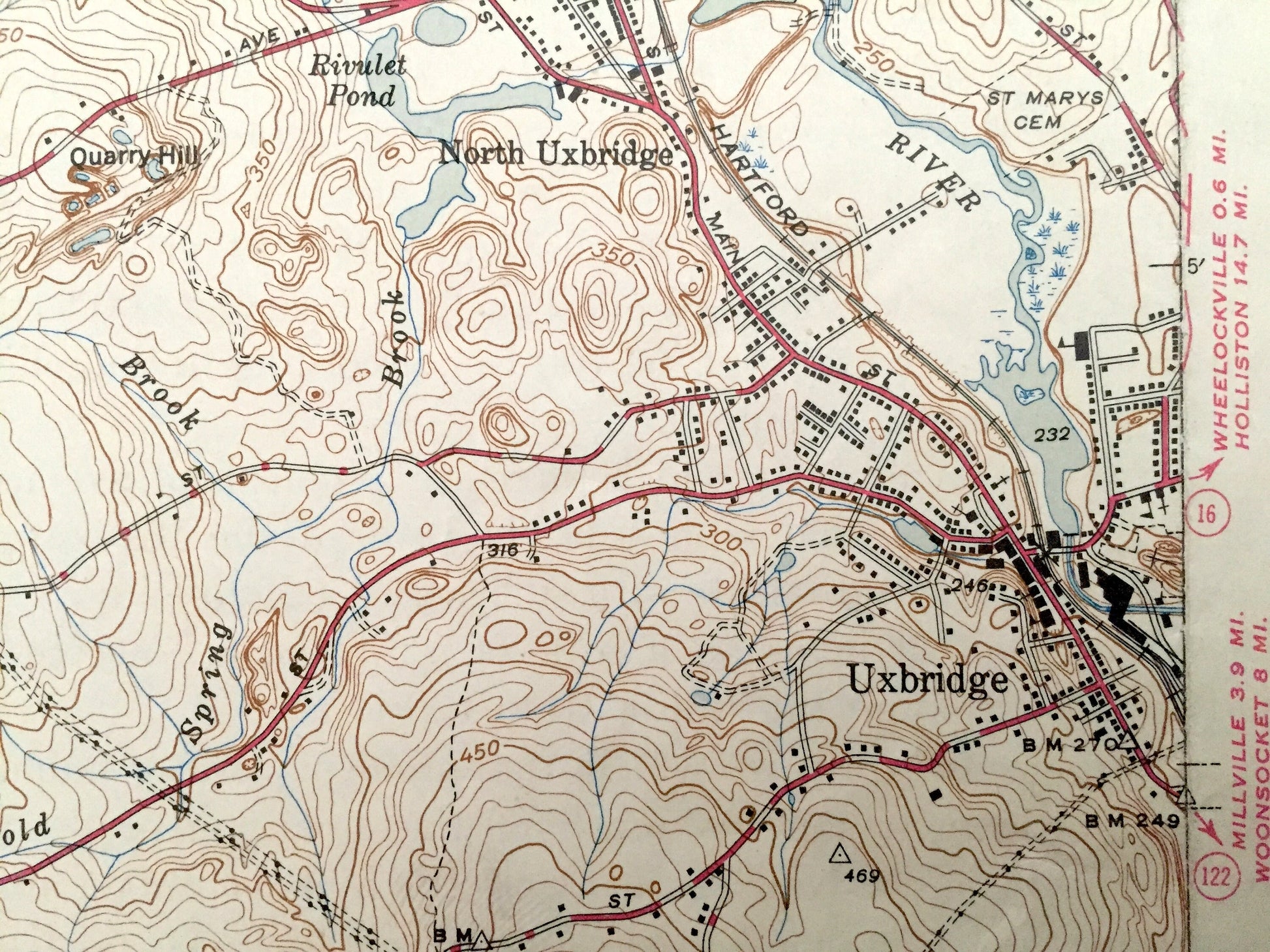 Points of Interest: Worcester County, Providence County, Whitins Pond, Lackey Pond, Blackstone River, Gilboa Pond, Castle Caves, Caswell Brook, Bad Lands, Goat Hill, Cedar Swamp, Chockalog River, Lee Pond, and lots more hills, mountains, streams, ponds, houses, schools and roads.