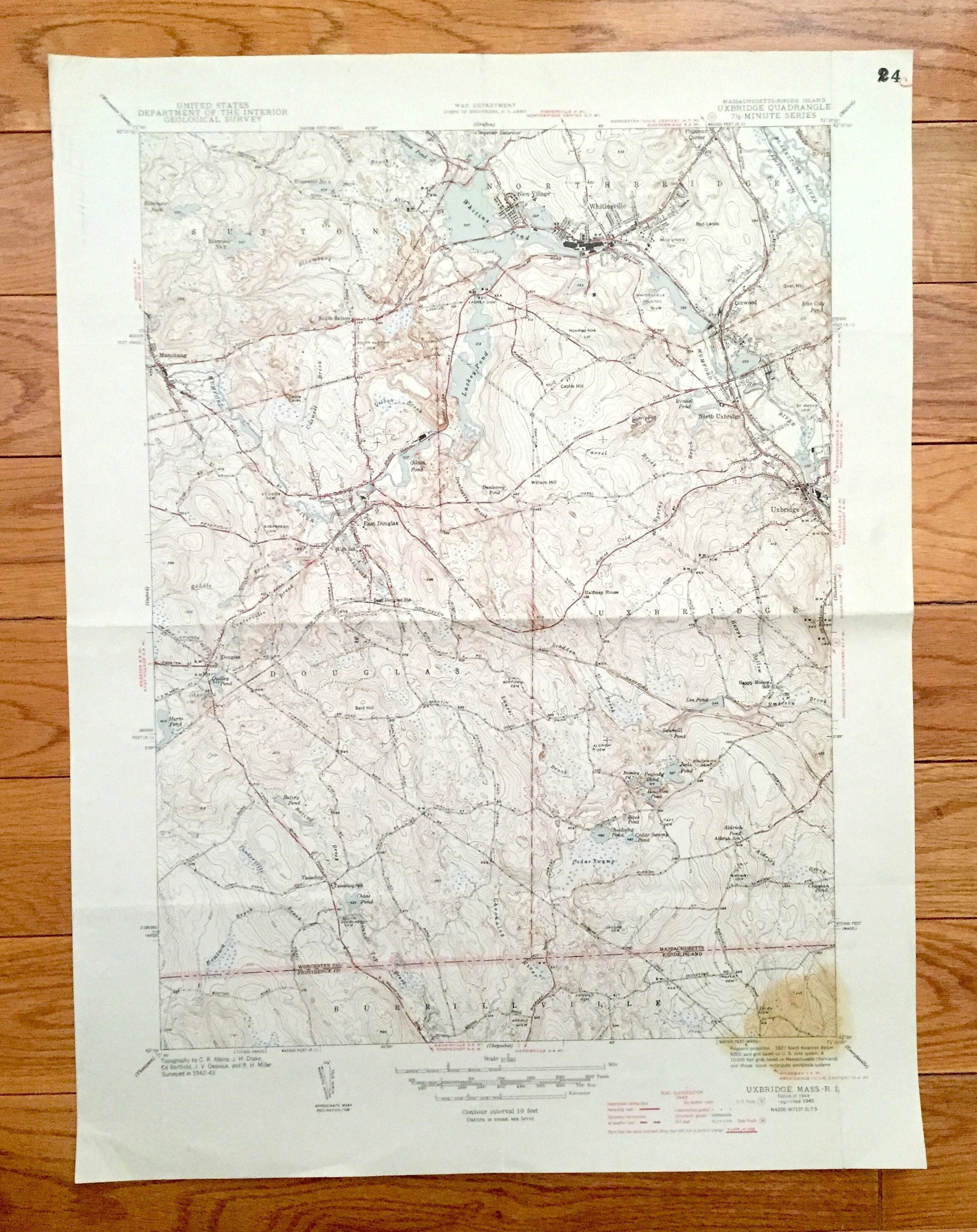 Beautiful, antique map of Uxbridge, Massachusetts and surrounding Worcester County & Providence County, Rhode Island. This is an authentic 1944 edition, 1945 print from the U.S. Geological Survey and NOT a computer reproduction.