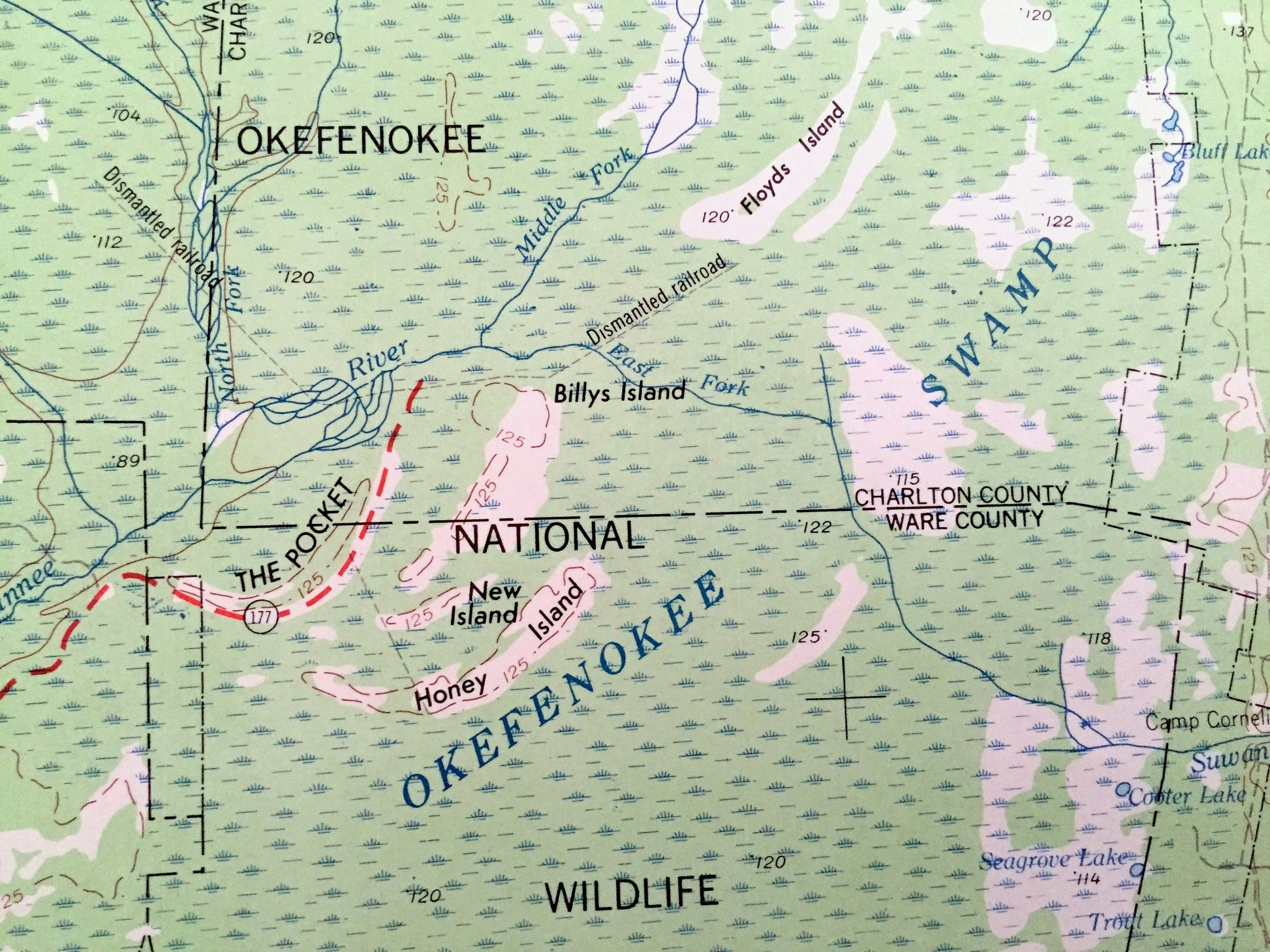 Points of Interest: Georgia - Okefenokee National Wildlife Refuge, Okefenokee Swamp, Withlacoochee River, Moody Air Force Base, Lake Verne, Honey Island, Black Jack Island and lots more hills, mountains, lakes, islands, bays, highways, railroads.