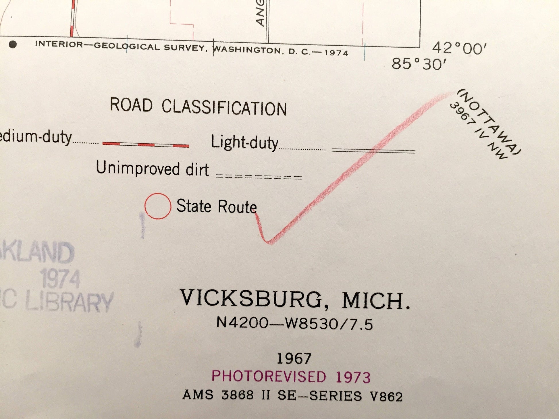 Beautiful, antique map of Vicksburg, Mendon, Brady, School Craft and Park, Michigan. This is an authentic 1973 print of 1967 survey data from the U.S. Geological Survey and NOT a computer reproduction.