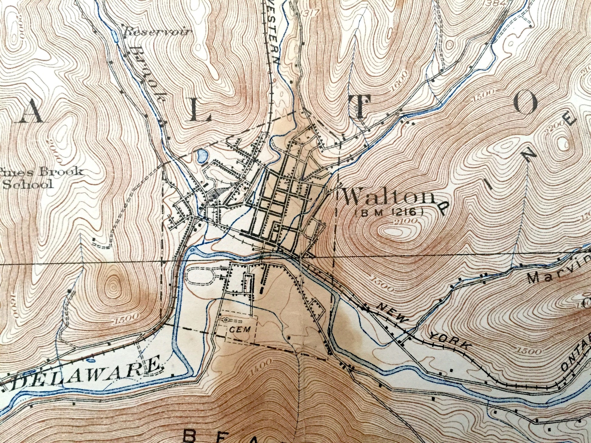 Beautiful, antique map of Walton, New York and surrounding Delaware County area. This is an authentic 1925 edition, 1934 print from the U.S. Geological Survey and NOT a computer reproduction.