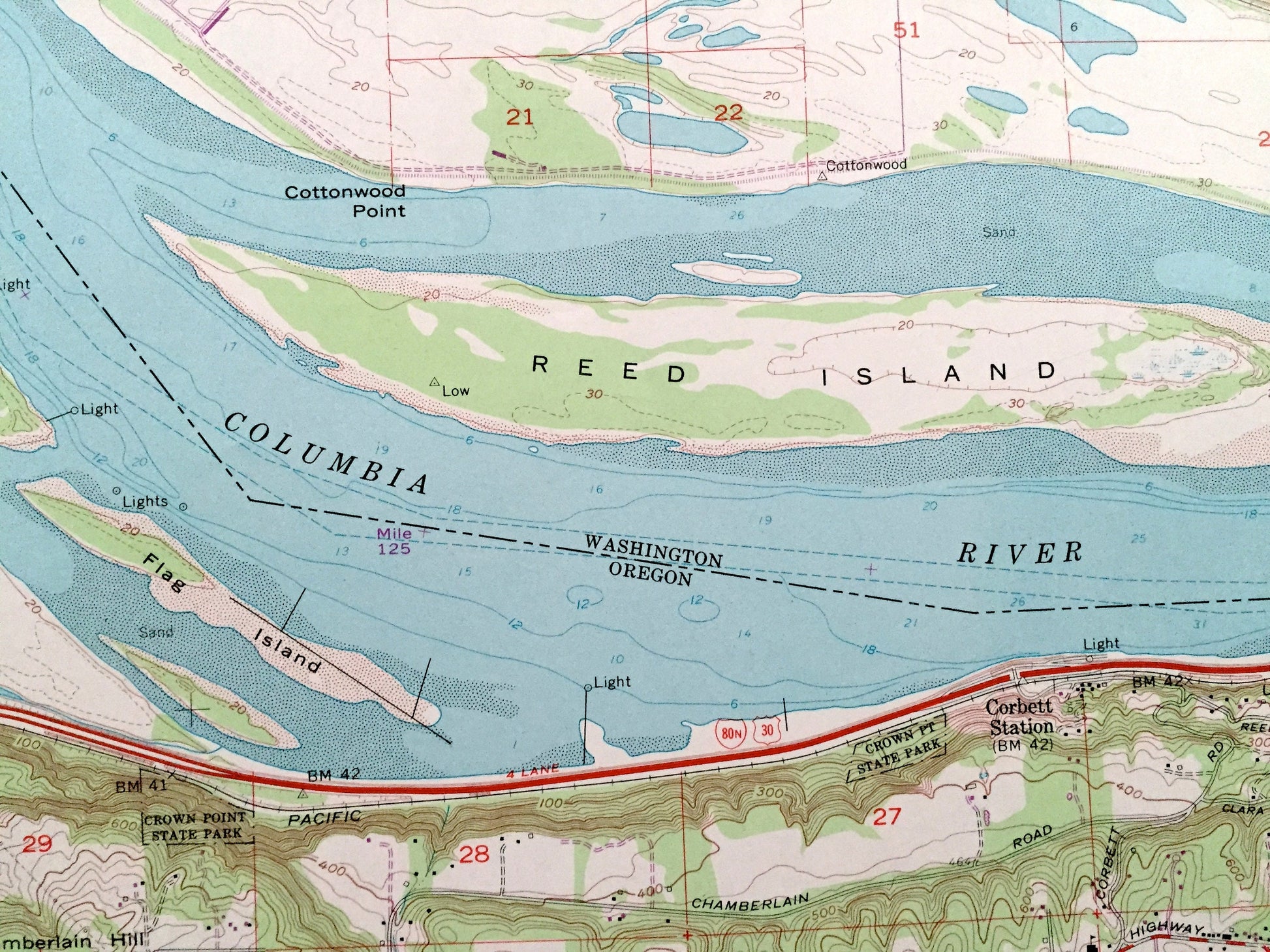 Points of Interest: Lewis and Clark State Park, Crown Point State Park, Rooster Rock State Park, Dabney State Park, Mt Norway, Nichols Hill, Woodbury Hill, Chamberlain Hill, Howard Canyon, Knierien Canyon, Camp Collins, Reed Island, Gary Island, Flag Island, Columbia River, Sandy River, Washougal River, Smith Creek, Gibbons Creek, Campen Creek, Lawton Creek, Big Creek, Pounder Creek, and many more hills, streams, ponds, houses, schools, railroads, churches and roads.