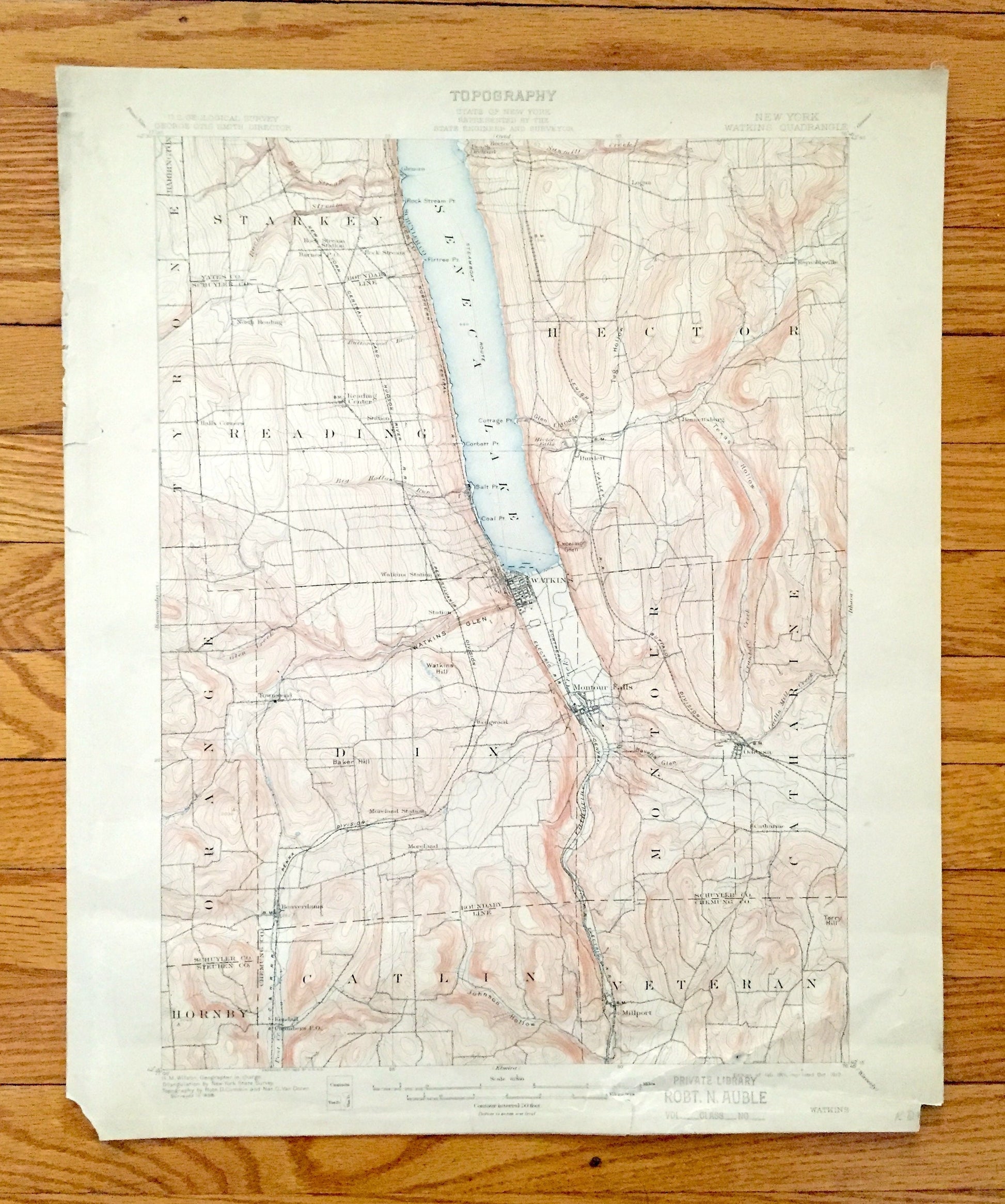 Beautiful, antique map of Watkins Glen, New York and surrounding Schuyler, Yates, Steuben & Chemung County area. This is an authentic 1901 edition, 1912 print from the U.S. Geological Survey and NOT a computer reproduction.